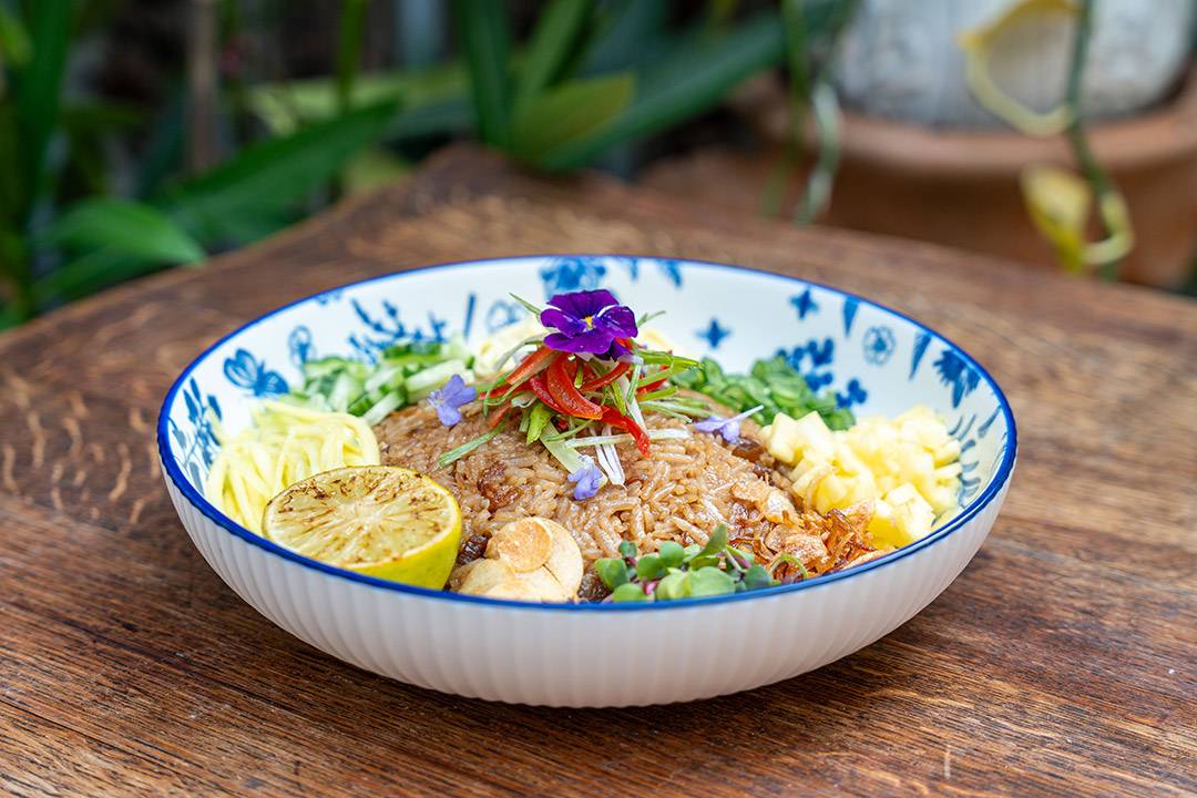 Thai fried rice infused with fermented sauce, with cucumber, green mango,