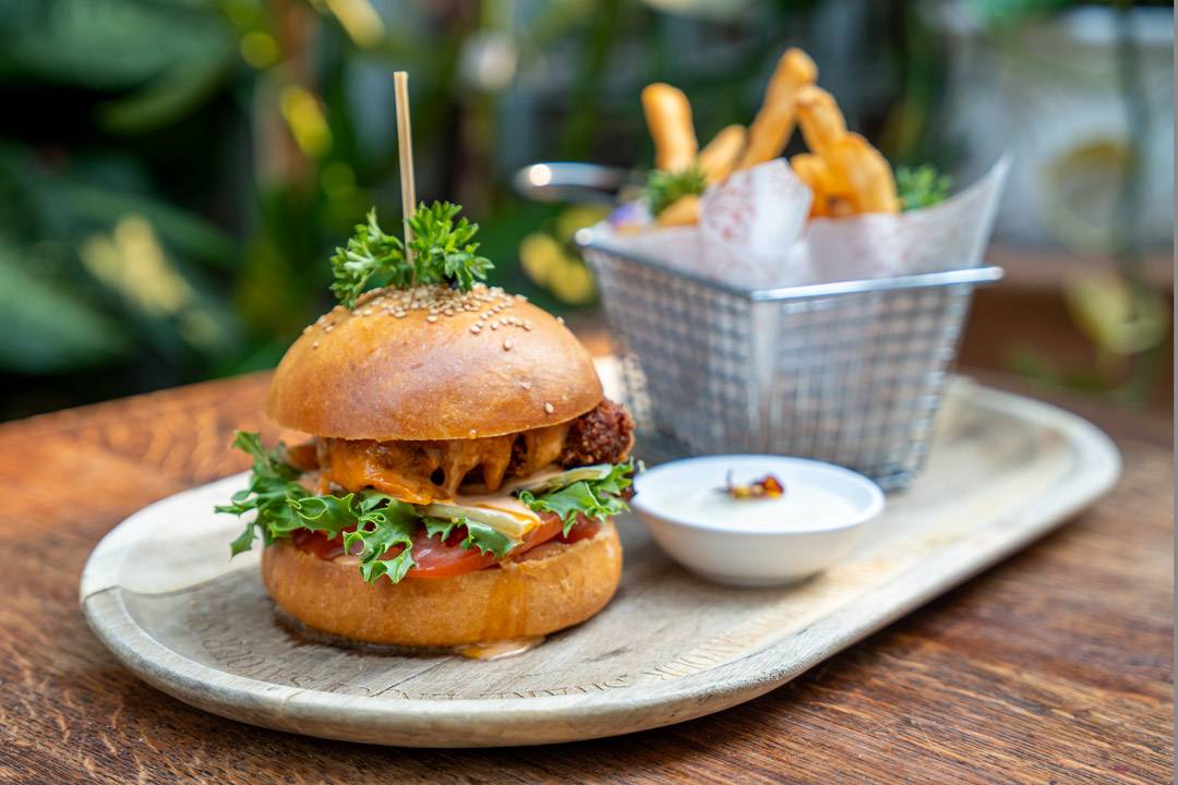• Lemongrass Chicken, Green Mango & Red Curry in a Beetroot Bun