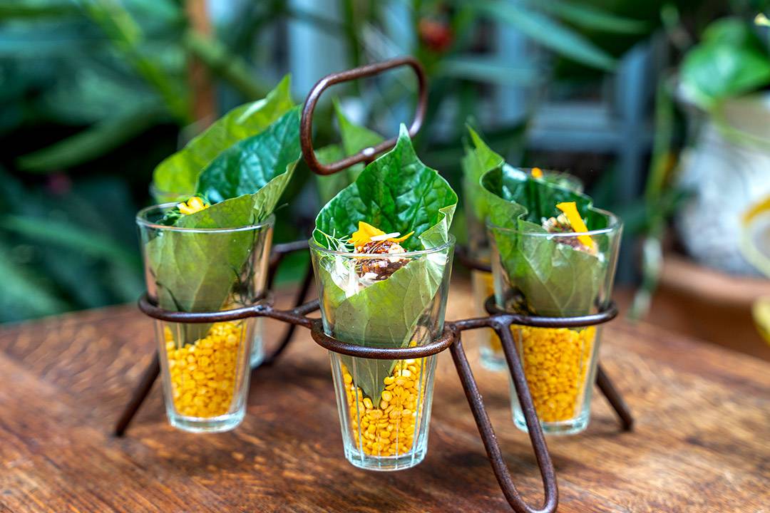 Betel leaf bites with ginger, pomelo, pineapple, lime, peanuts, herbs, and