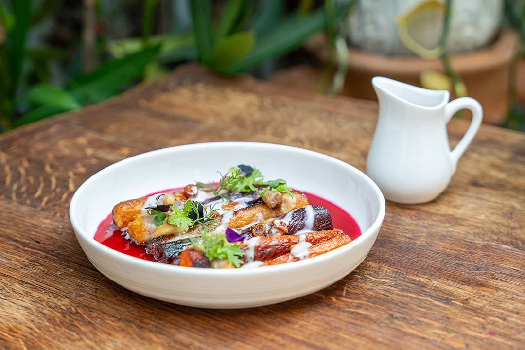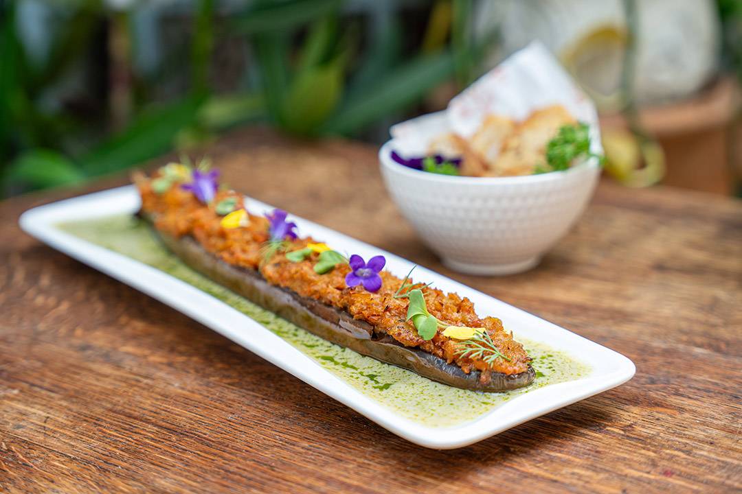 Seared eggplant baked with herb butter, topped with poached carrot and a
