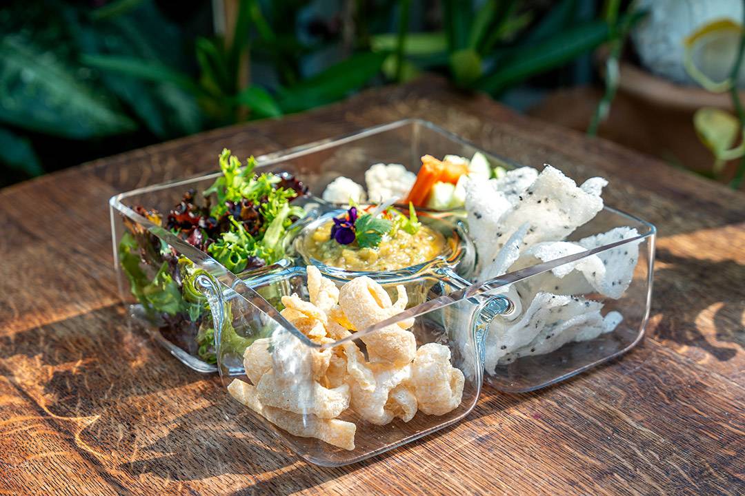 Crispy pork crackling rice cracker, and vegetables. Served with grilled