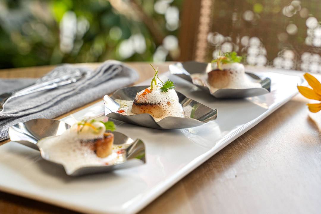 Pan-seared scallops in herb butter and Tom Kha herbs. Tangy, citrus, and