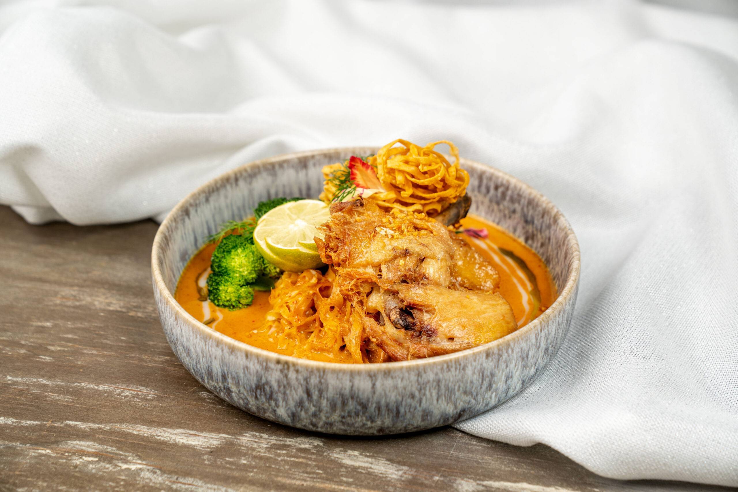 Chicken leg confit served with egg noodles, seasonal veggies, spicy khao soi gravy