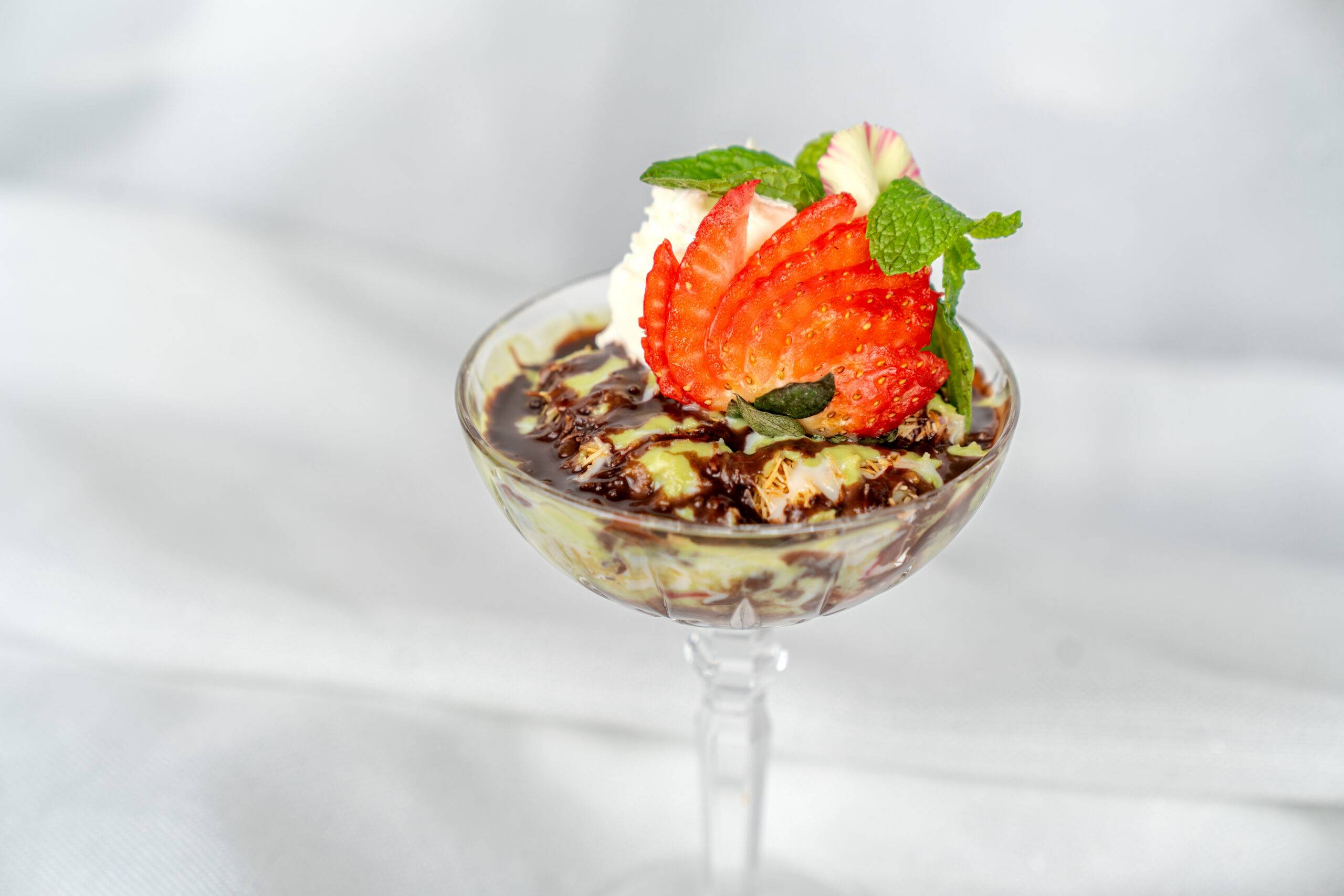 Layers of Banana, Strawberry, Cream & Cookie Crumble with a Coconut Caramel Sauce